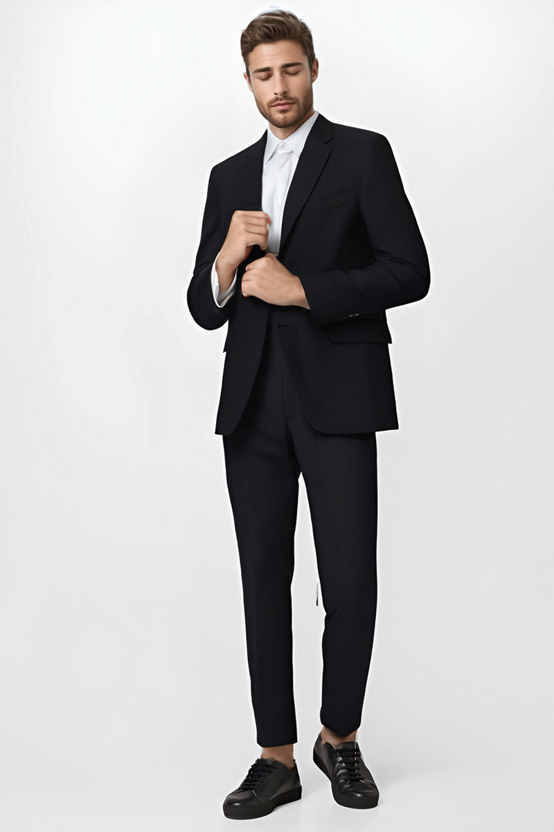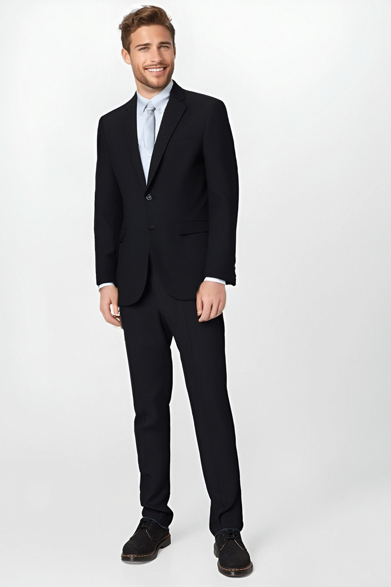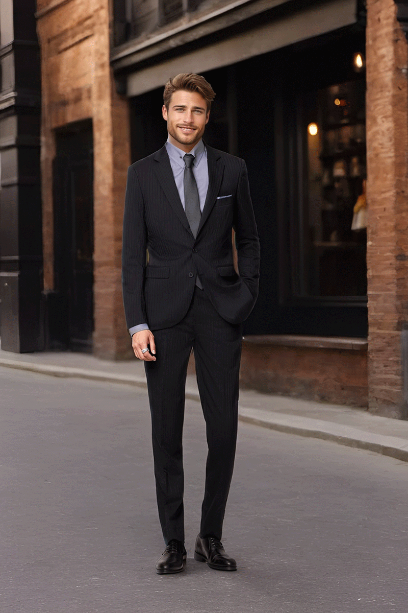Schwarzer, schmal geschnittener, 2-teiliger Nadelstreifenanzug mit 2 Knöpfen
