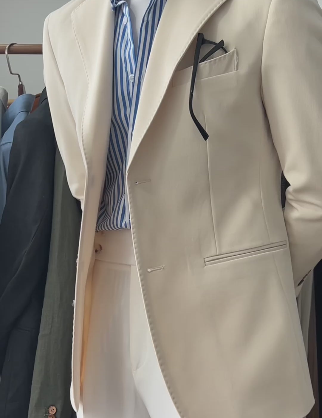 Traje de dos piezas con solapa con muesca y dos botones en color beige y blanco