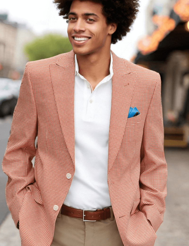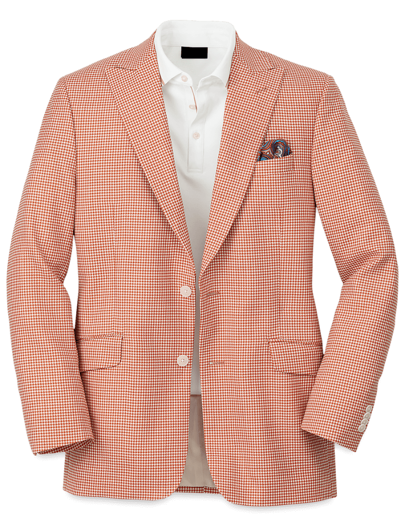 Chaqueta de lana con solapa de pico y botonadura sencilla en pata de gallo en color naranja y blanco