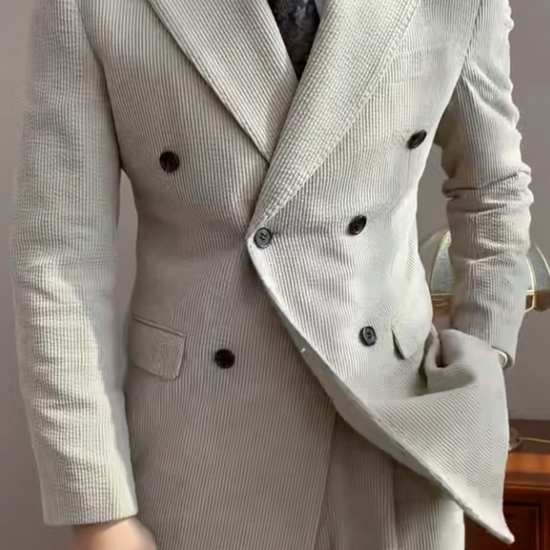 Elegant and modern, this beige pinstripe double-breasted suit is tailored for a sharp and confident look. The classic peak lapel and subtle pinstripe design add timeless sophistication, making it perfect for weddings, business, and formal occasions. A refined 2-piece suit designed for men who value style and confidence.