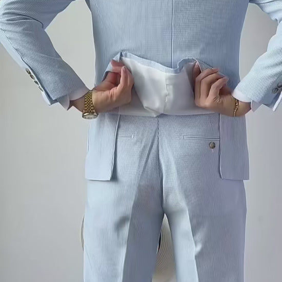 Stay cool and polished in this seersucker pinstripe notch lapel 2-piece suit, designed with a lightweight, breathable fabric and modern tailored fit. The classic pinstripe pattern adds refined style, making it perfect for business, summer events, weddings, or smart casual occasions. Comfortable and versatile, it delivers effortless elegance and all-day wearability.