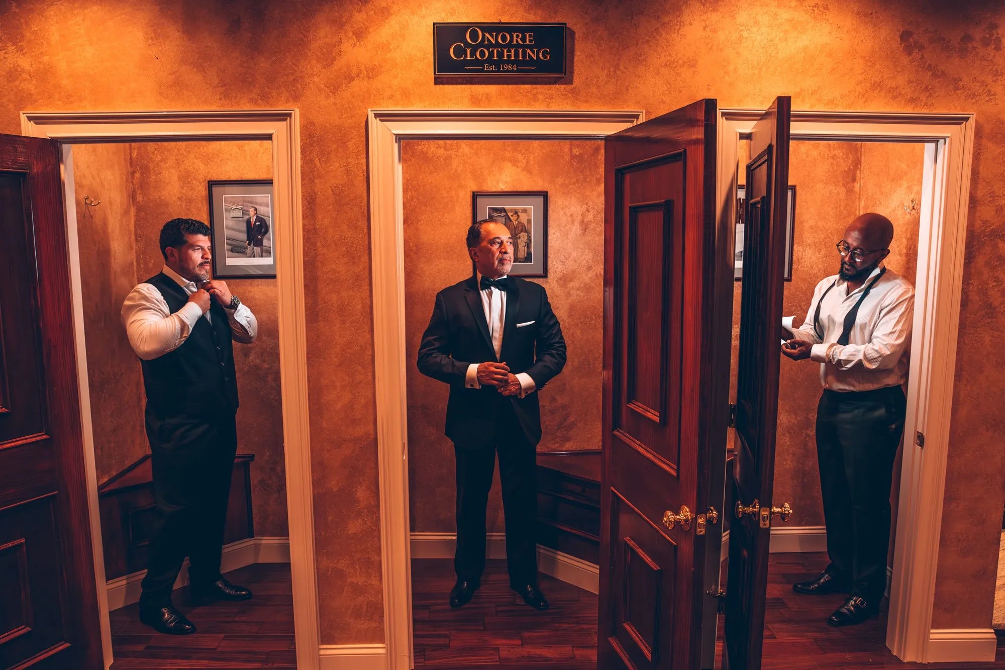 Mariages en intérieur : Les costumes noirs ou bleu marine sont excellents pour créer une ambiance formelle et élégante.