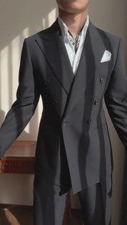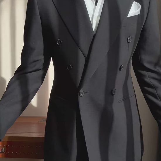 Elevate your formalwear with this sleek black peak lapel suit. The double-breasted design brings bold sophistication to any upscale event.