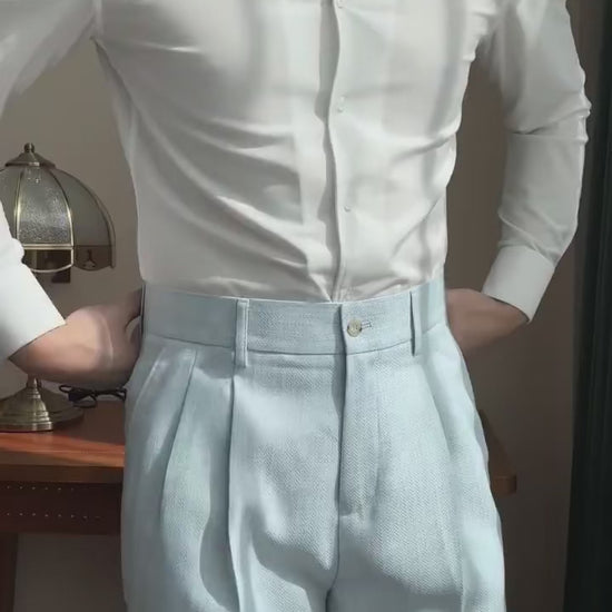 Fresh and refined — this light blue double-breasted suit with a peak lapel is your go-to for weddings, garden parties, and standout summer events.